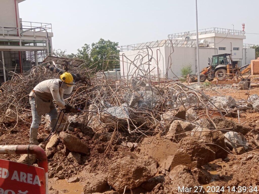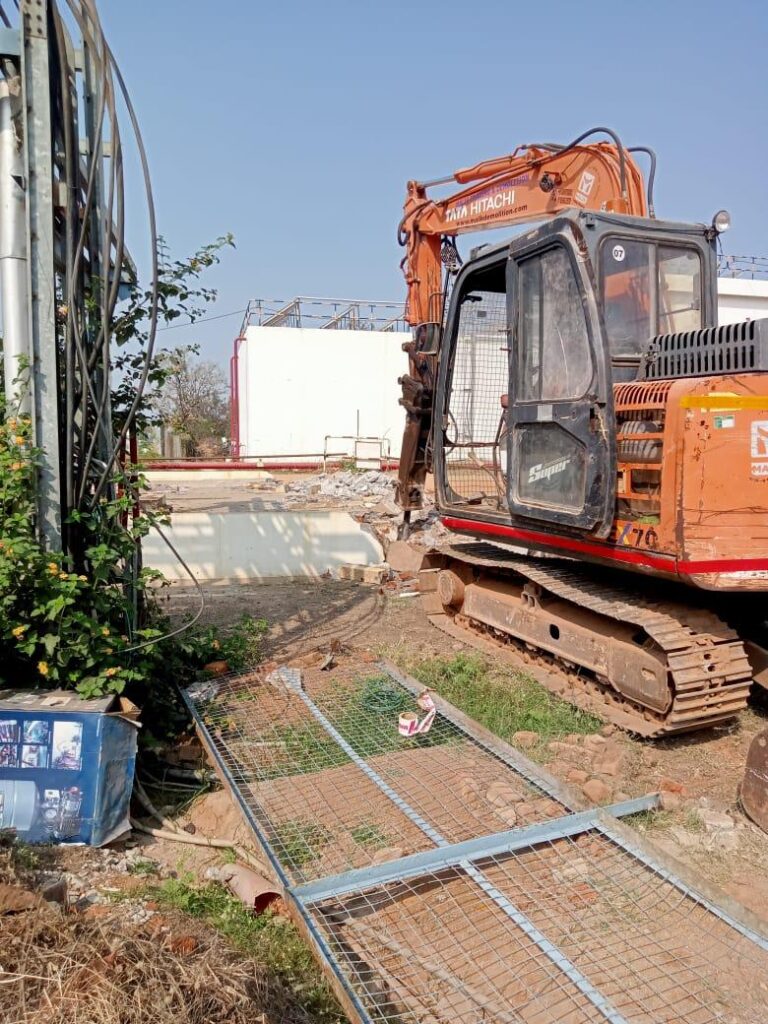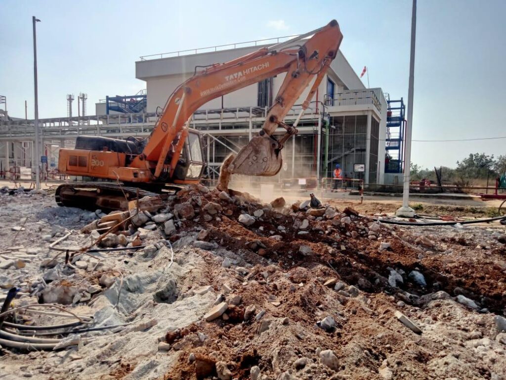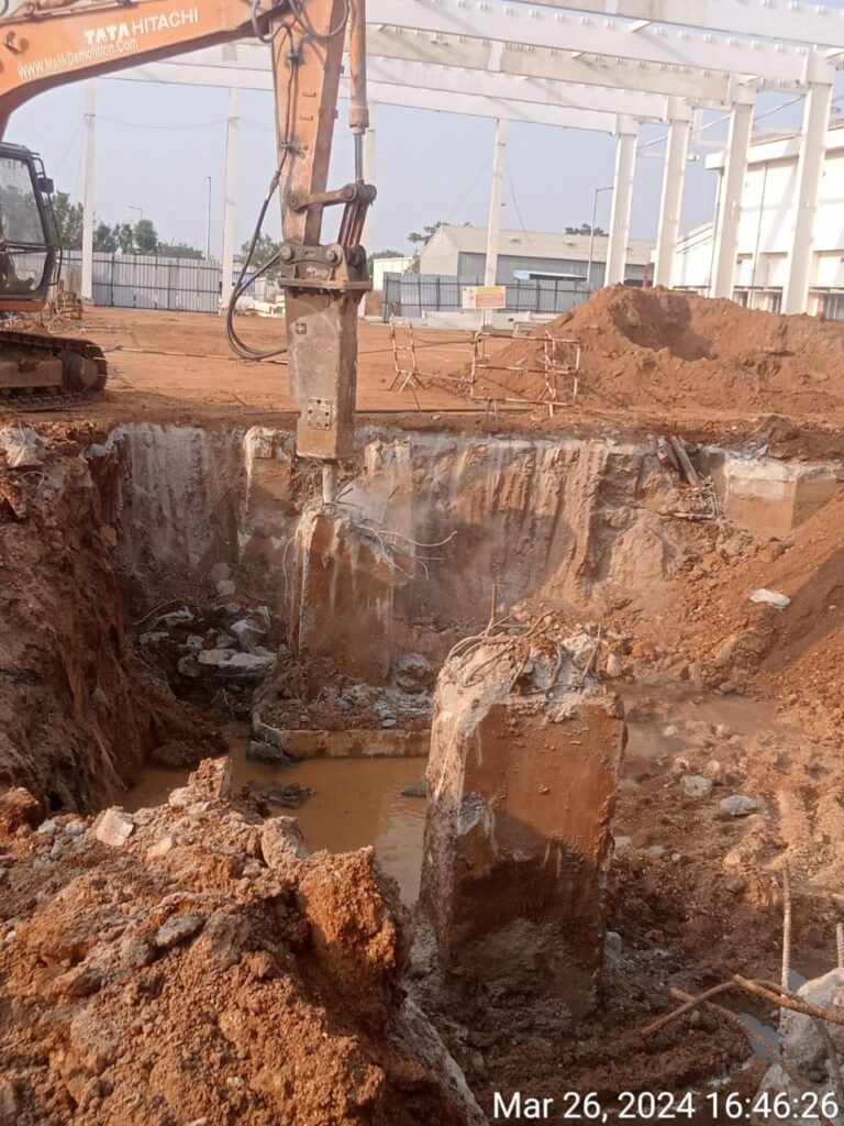 Civil structures such as concrete roads and civil foundations were systematically handled using suitable methods. The work was executed with precision using rock breaking and breaker machine operations, ensuring controlled dismantling and safe completion of the project.