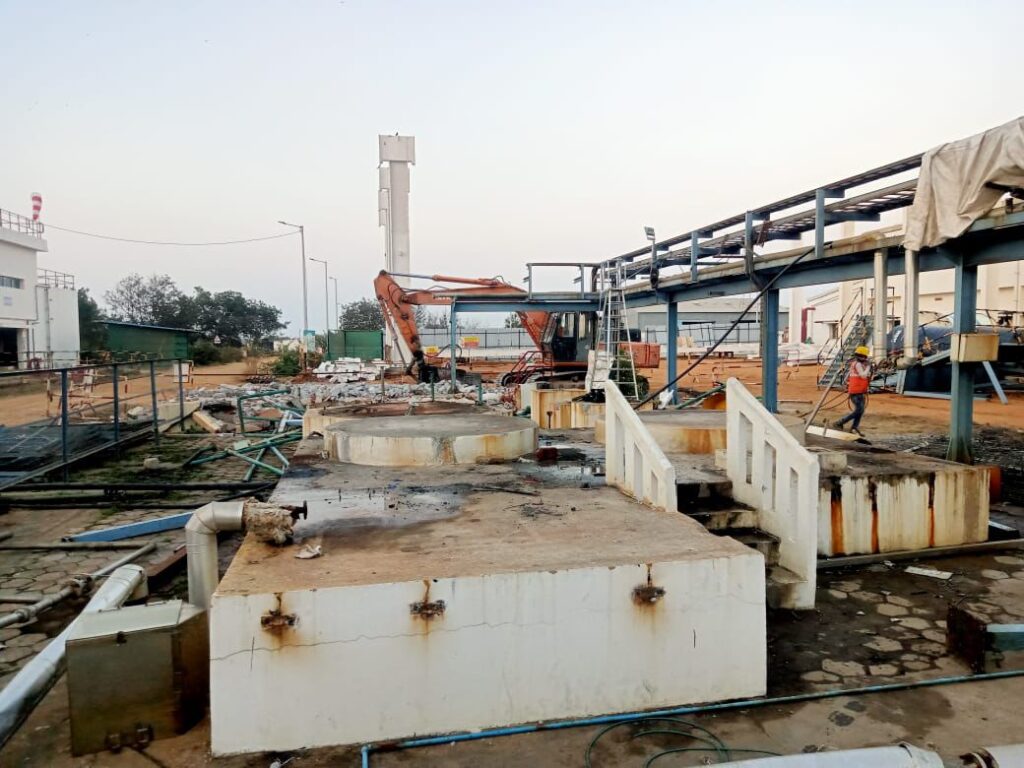 To maintain safety within the plant environment, the demolition was carried out in stages. Each section of the structure was carefully dismantled to minimize vibration and structural impact on nearby facilities.